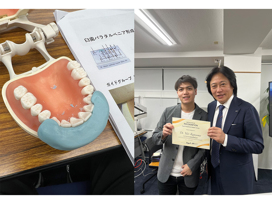 今回のセミナーでは前歯の表側のみを薄く削り、歯の耐久性を損なわれることなく審美性、形を綺麗に仕上げるような治療の実習でした。